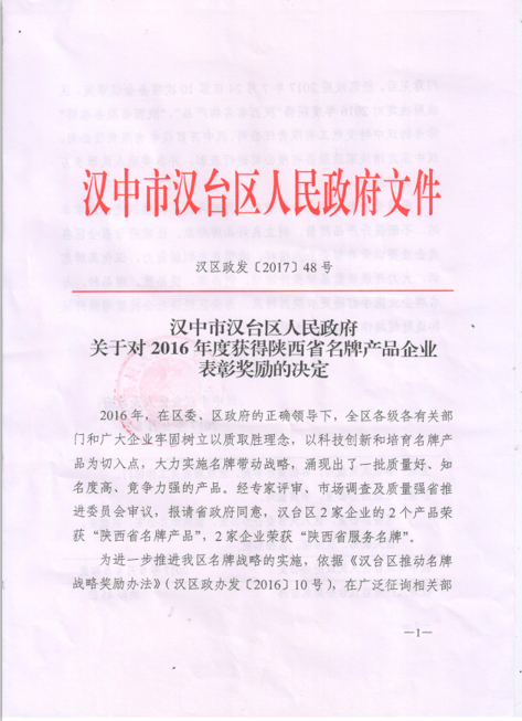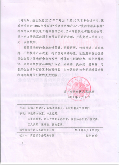 【東方家政】2016年度獲得“陜西省名牌產品企業表彰獎勵”