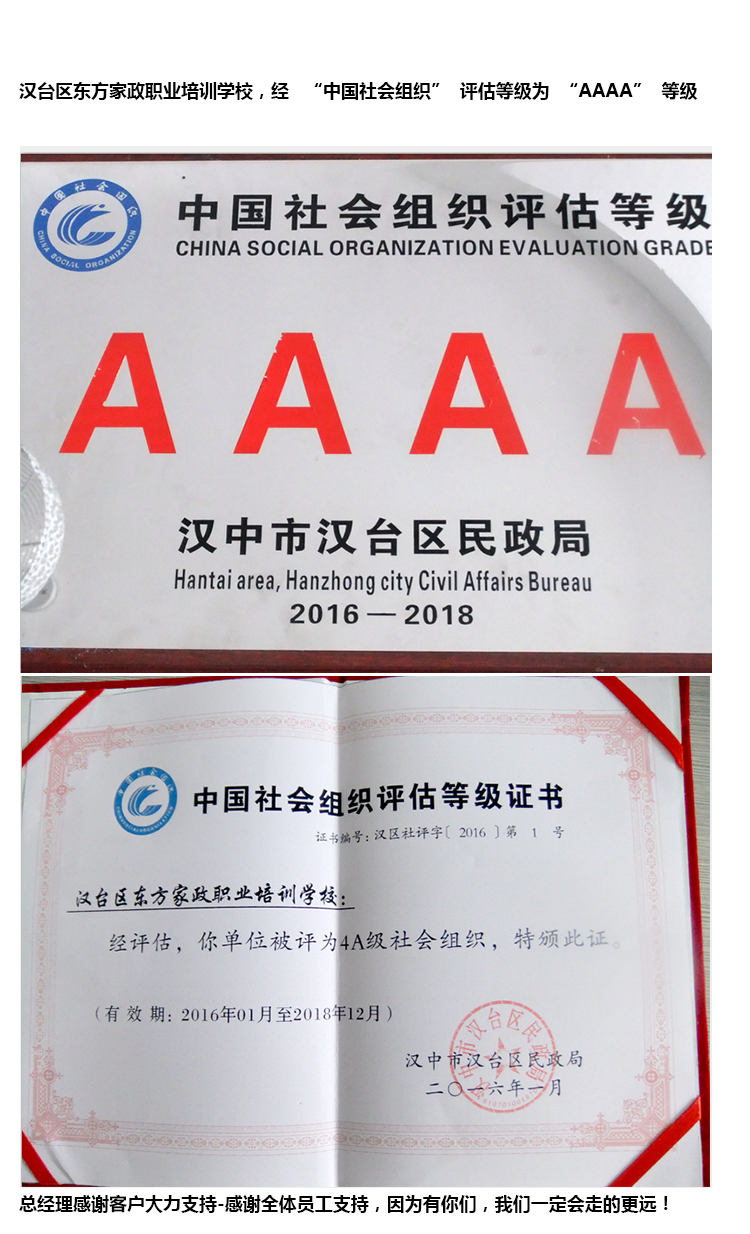 <p class="zheng">【东方家政】汉台区东方家政职业培训学校经专家评审为 “AAAA”  等级</p>